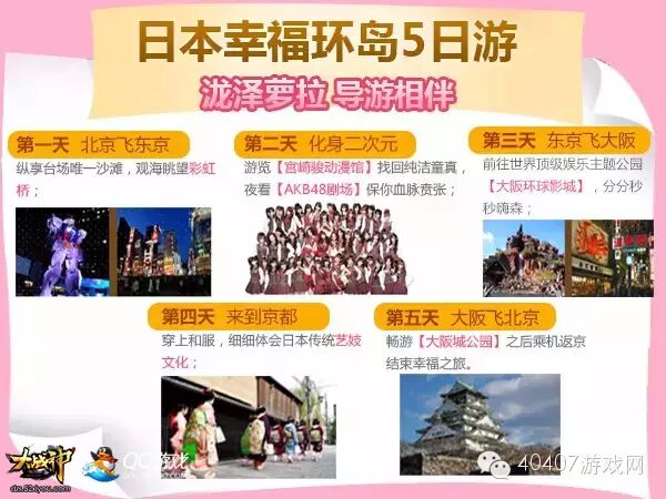 不在现场?没关系!QQ游戏大厅全程高清直播,多个媒体频道也会同步图文直播!你能多次参与线上抽奖、为现场各方阵领袖点赞投票,游戏红包拿到想笑!还有3个日本环岛5日游,想要你就动动手。是的,就是要奖奖奖奖不停的节奏!