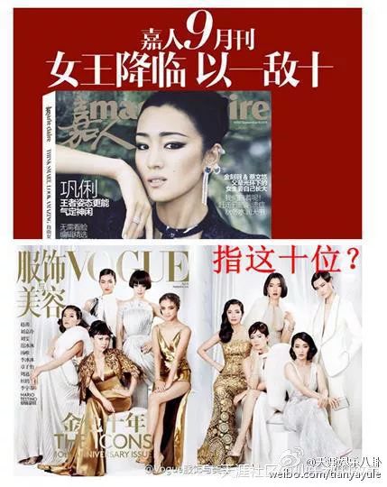 这三年,每到九月刊一定会拿出来说的一个例子当属2015年度的九月刊PK大战——《VOGUE服饰与美容》九月刊汇集了十位一线女星+超模的豪华阵容,却拍了一组十分一言难尽的封面,《嘉人》九月刊封面只请来了巩俐一人坐镇,并打出了“女王降临 以一敌十”的宣传语,这不是暗示,这是明显要开撕!