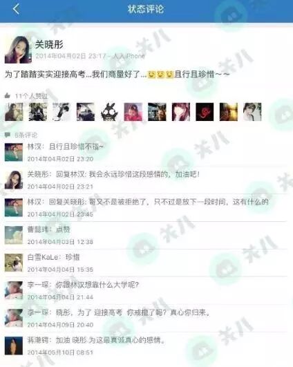 从日志和心情动态来看,关的小男友属于霸道总裁系列的,两人相恋时间大约于12年的4月份。通过账号还发现两人分手的原因是关以备战高考暂时分手,男生也傻呵呵的信了,然后就没有下文了。