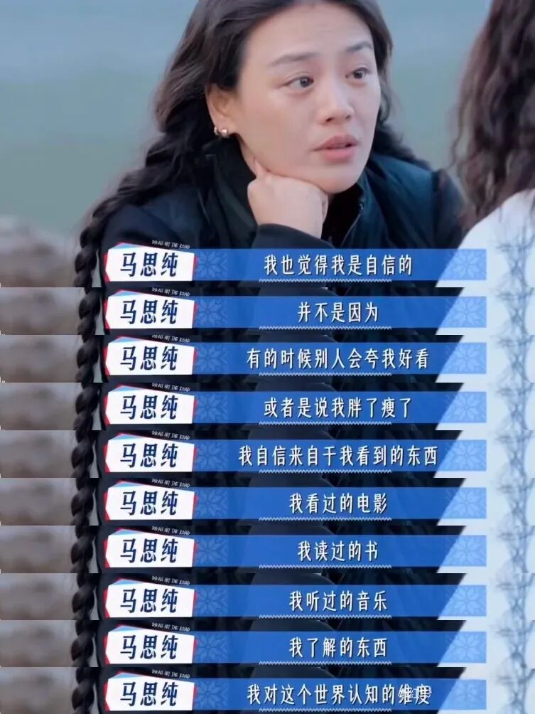 马思纯说得也太好了吧!!如果你觉得我是自信的,那么我告诉你我的自信不来自于外界对我外貌的评价。什么胖了瘦了,我的自信来自于我看过的世界,我读过的书,我看过的电影和我知道我一直想要学习的心。