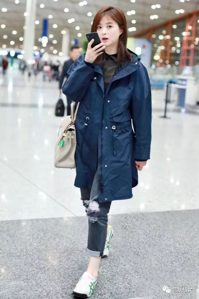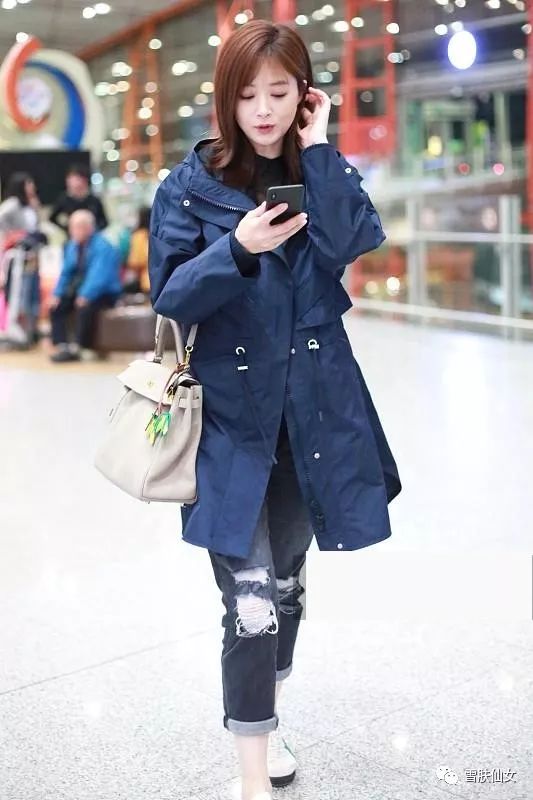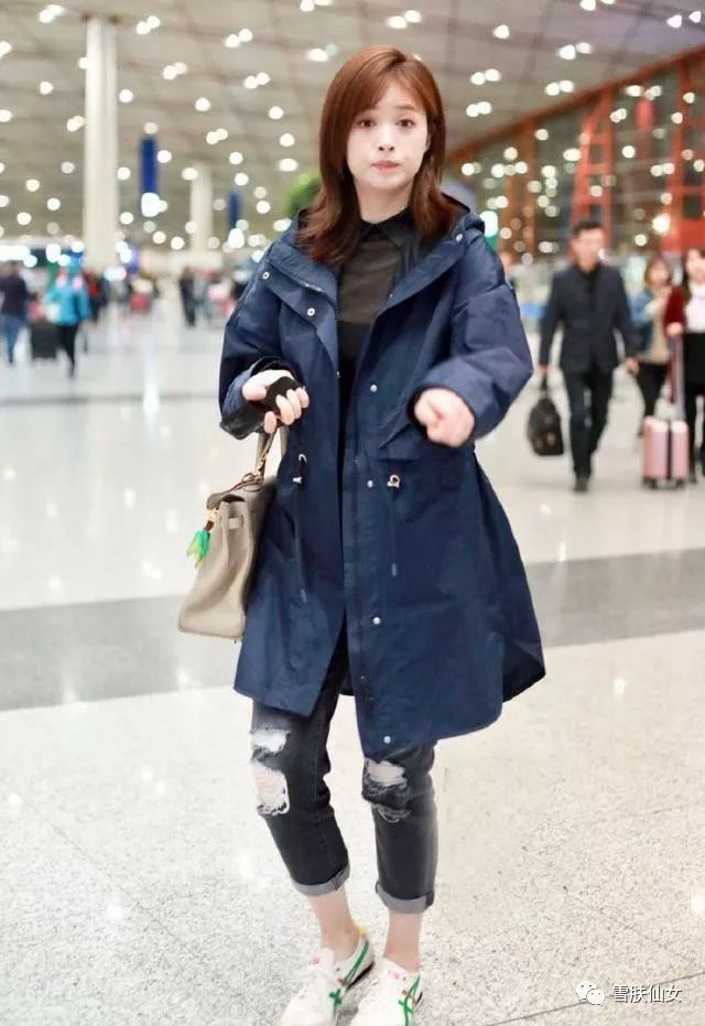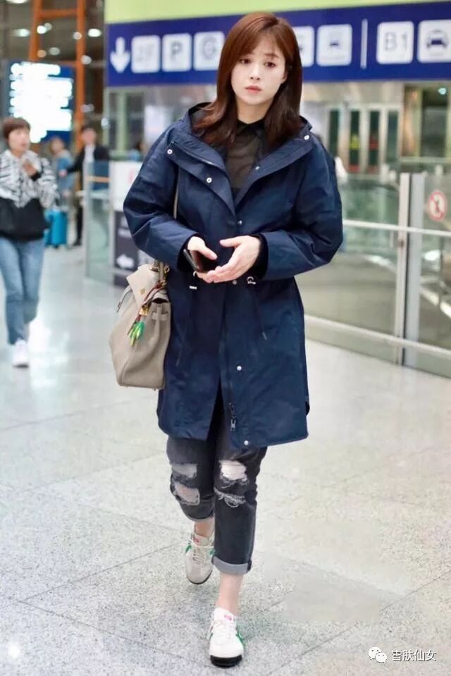 下身穿着牛仔裤,而且还是破洞牛仔裤。虽然“破洞”元素在当下很流行,但是极少看见蒋欣这个朴素又接地气的“邻家大姐姐”穿。而这次的机场造型,一条破洞牛仔裤走机场,时髦又个性啊!