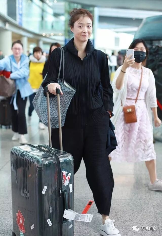 比如这一身造型,虽然黑色是比较显瘦的颜色。但是蒋欣的这一身机场造型,选择了一身特别宽松的黑色套装。就算不是微胖身材的女孩子这样穿,也会显胖吧。其实,对于微胖身材的女生来说,不能穿太修身的服装,只需稍微宽松一些就够了。
