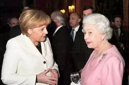 面对雍容华贵的英国女王,默克尔同样只是简单的一条琥珀项链,却淡雅干练,不落下风。