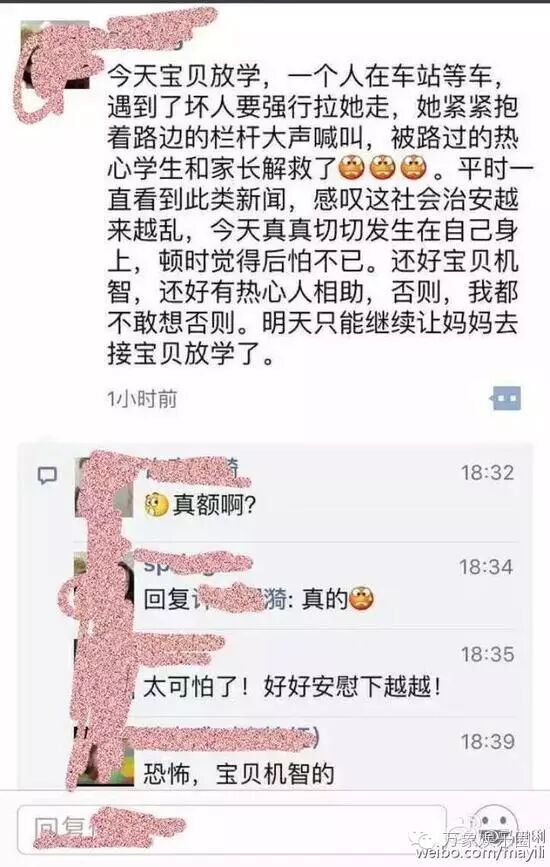 新浪娱乐讯 5月24日,马伊琍[微博]po 出一张朋友圈截图,并称:“这是今天下午发生在上海市虹口区的事,孩子的妈妈是我初中好朋友。”马伊琍好友称,自己的孩子放学后,一个人在车站等车,遇到 坏人强行拉她走,她紧紧抱着路边的栏杆大声喊叫,被路过的热心学生和家长解救了。马伊琍呼吁大家遇到这种事情一定记得上前询问及帮助!