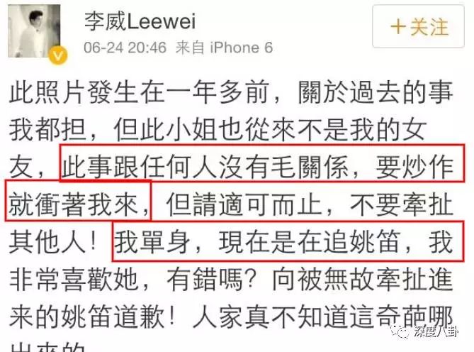 而李威在看到杨子晴曝光的照片后,就慌忙在微博里澄清,说是杨在炒作,他们只不过是朋友关系,并且承认正在追姚笛,还表白说“非常喜欢她”。这样直接的公开追求、示爱,在娱乐圈应该也是第一次。