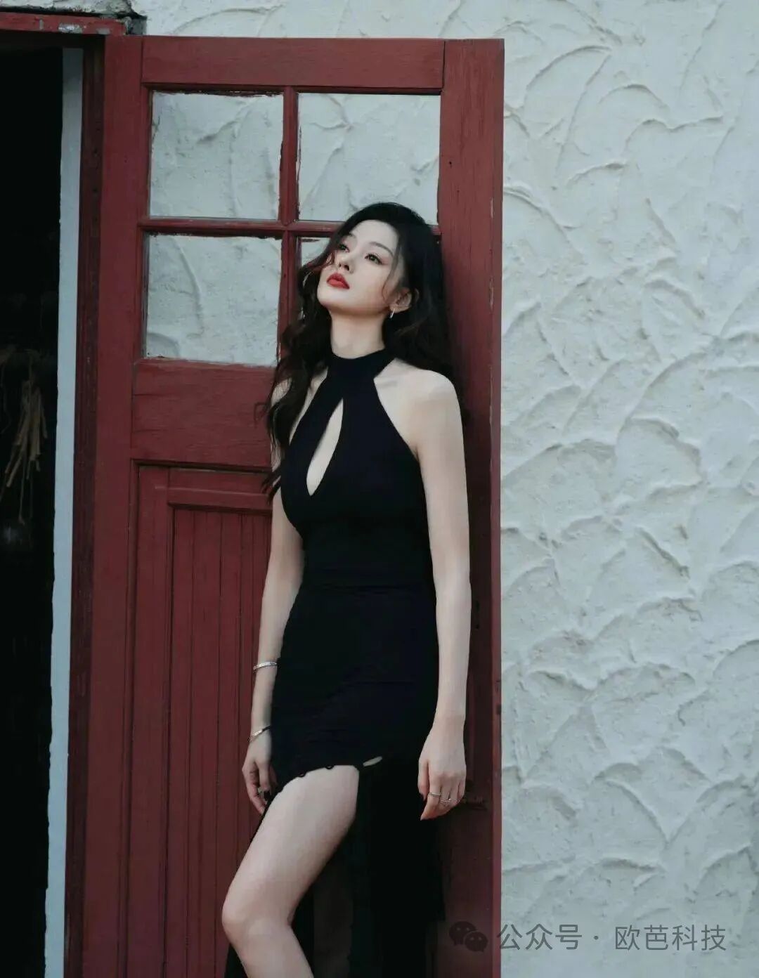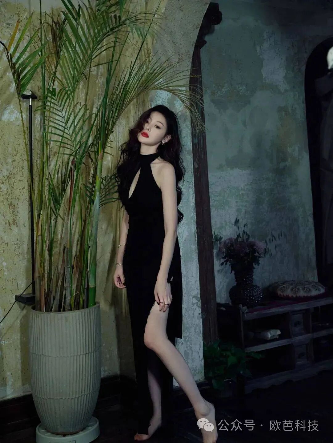 她那一袭黑裙,深V开叉设计,美腿随风摇曳,颜值和气质并存,就像是个行走的艺术品。半扎起的大波浪发型,随意垂落的几缕刘海,温婉又不乏时尚感,完美展现了她的多面魅力。