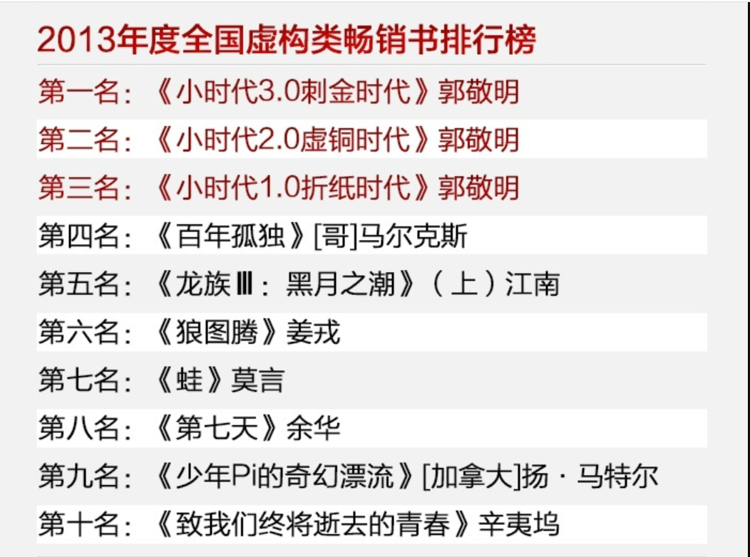 即便是到了对中国文学意义非凡的2012年,莫言首次替中国人摘下诺贝尔文学奖的桂冠,在各大城市的店畅销榜上,郭敬明的《小时代3.0:刺金时代》依然排在莫言前面,位居第一。
