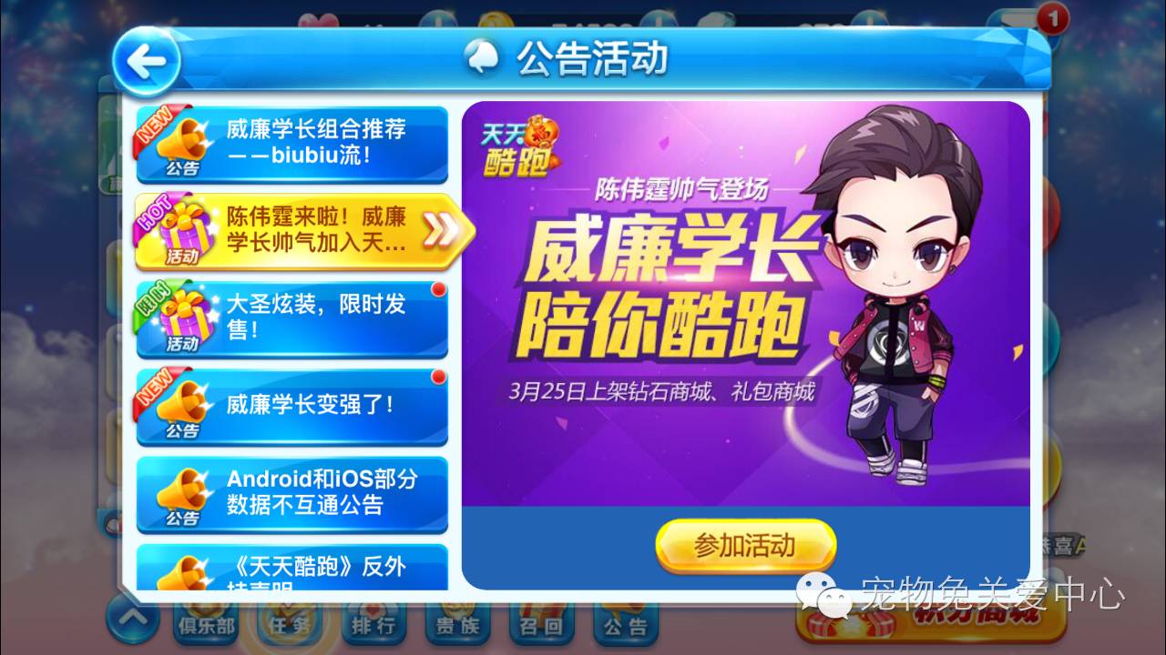据悉,《天天酷跑》是国内移动游戏的领军之作,其动感的音乐、Q萌的游戏界面、爽快刺激的跑酷游戏体验,吸引了全国超过5亿的注册用户。在最新发布的锦标赛版本中,用户可以和陈伟霆化身的“威廉学长”一起驰骋酷跑世界,更可以和5亿玩家一起在多种赛事模式中进行PK比拼,争夺排位。威廉学长也是目前《天天酷跑》中唯一一个没有冷却时间,可以主动召唤技能的角色。而今年全新上线的兄弟篇《天天酷跑3D》,主打3D竖版同屏对战玩法, 给游戏用户带来身临其境的全新跑酷体验。为迎接威廉学长的加入,《天天酷跑3D》开启了全新的音乐节版本,玩家可以感受音乐和跑酷的动感结合,迎接威廉学长的到来。