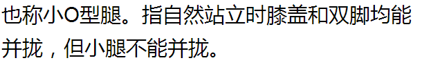 股骨外旋,胫骨内旋也称膝内翻。是指自然站立时两脚内踝能相碰而两膝盖不能靠拢。