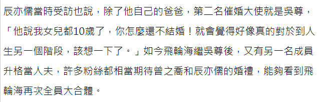 自从吴尊有了小孩后,大部分精力都放在家庭上,飞轮海成员也鲜少公开亮相,如今辰亦儒宣布结婚,大家也期待在他的婚礼上,可以看到飞轮海再合体。