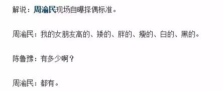 “高的、矮的、胖的、瘦的、白的、黑的”都有……给男神跪了,然后男神又说了,希望“另一半”要有灵性,这个答案实在是玄而又玄,估计喻虹渊有我们看不到的“灵性”吧。