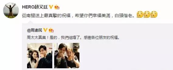 目前正在南极拍新片的赵又廷,得知仔仔结婚喜讯,送上祝福:“从南极送上最真挚的祝福,希望你们幸福美满,白头偕老。”