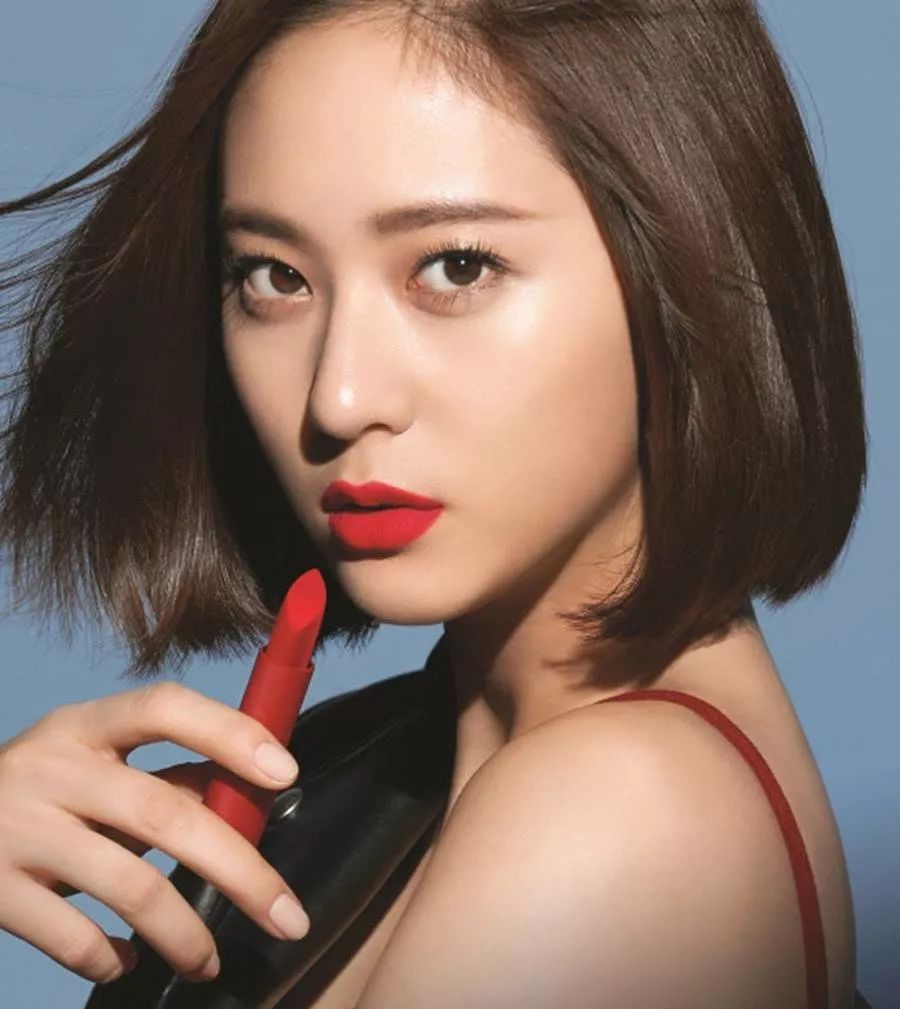 最近郑秀晶的画报中就用cherry tomato颜色作为重点,淡妆搭配显眼的口红,也让肤色显得更加透亮。与之前流行的果汁妆容相比更加大胆个性 。