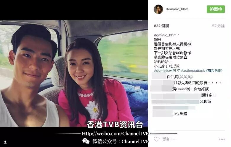 雖然網友唔Buy,不過一向我行我素嘅Dominic一於懶理,繼續展開「抽水Mode」!佢呢日上載咗一張同Louisa嘅合照,並留言:「嗰日邊個會估到有人貢(咁)精神,影完相笑完玩完,下一刻突然會哮喘發作,嚇到我咇咗兩粒尿!哈哈哈哈…小心身子啦以後。」公開話自己好擔心Louisa哮喘發作,Dominic真係完全唔避嫌,睇嚟林作都係要睇緊啲女友喇。