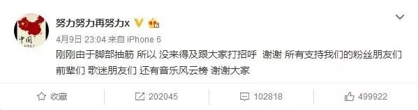 为了不让粉丝朋友们担心,他还特地发了一条微博解释当时的情况:刚刚由于脚部抽筋,所以没来得及和大家打招呼,