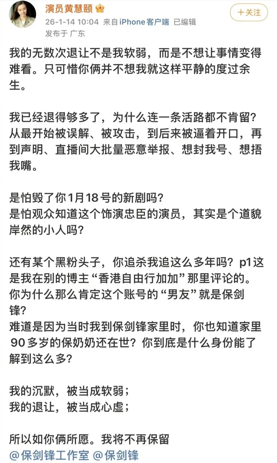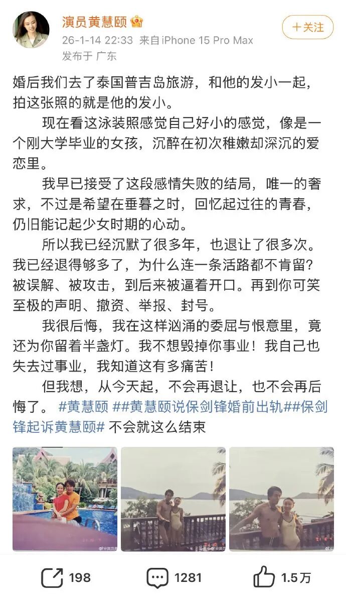 然而,付出并未换来珍惜,黄慧颐爆料称,保剑锋实乃“出轨惯犯”。