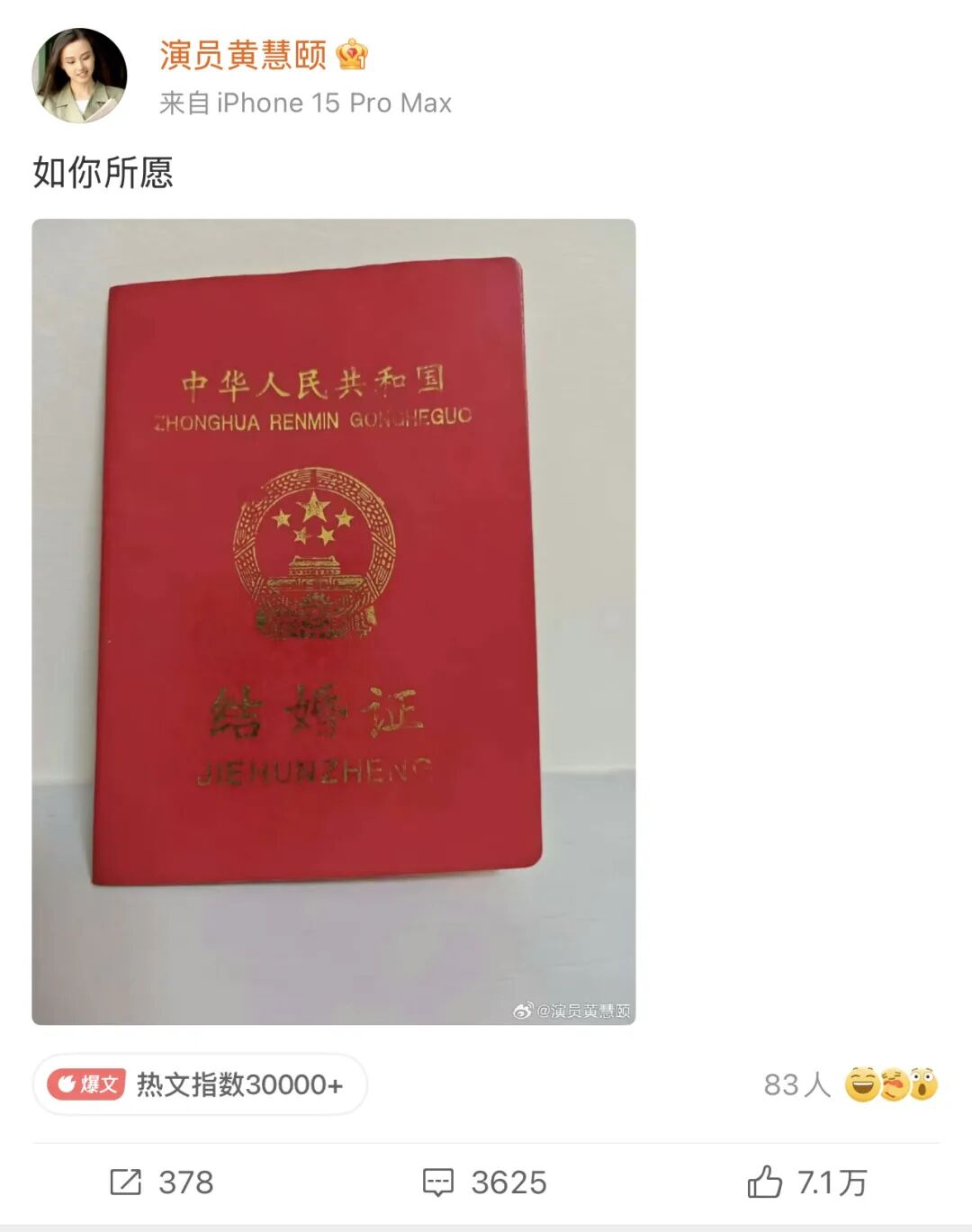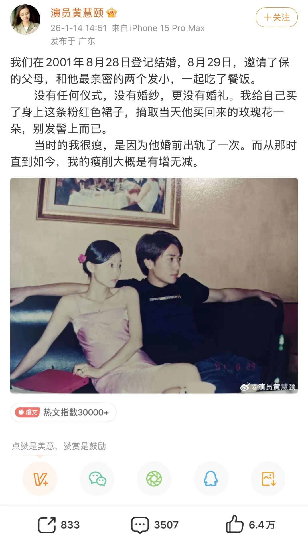 为了配合保剑锋的事业,双方选择了隐婚,直到对方大火离婚,黄慧颐都没对外指责过他。