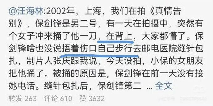 知名编剧汪海林还爆料称,在2002年保剑锋拍戏的时候被女友冲过来捅了一刀,被捅的原因是正是保剑锋没接她电话。