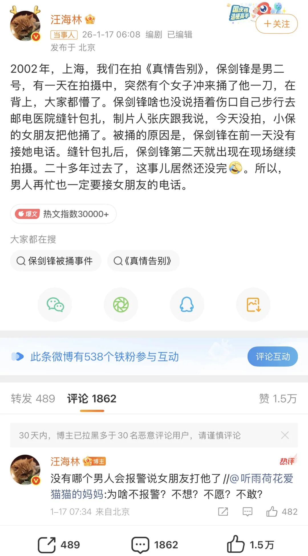 1月17日,编剧汪海林突然发文称:“2002年保剑锋在拍摄中,突然有个女子冲来捅了他一刀,在背上,大家都懵了。保剑锋啥也没说捂着伤口自己步行去邮电医院缝针包扎,制片人张庆跟我说,今天没拍,小保的女朋友把他捅了。被捅的原因是,保剑锋在前一天没有接她电话。”