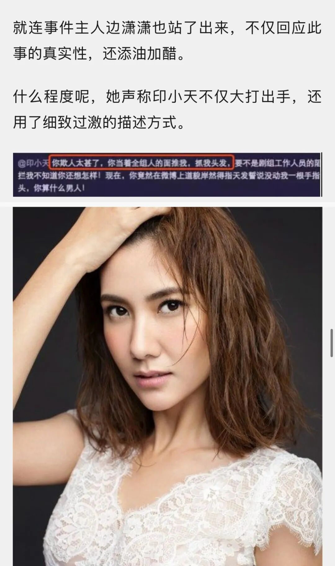 当时,女演员边潇潇控诉男演员印小天在片场殴打自己。