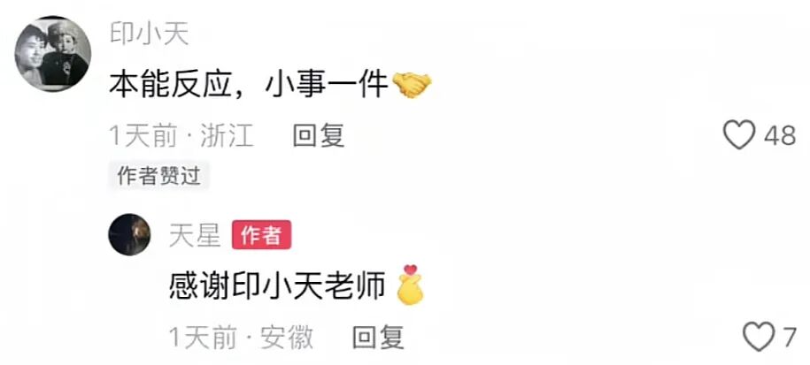 12月10日,印小天个人社交平台账号在宋先生的这条视频下回复表示:“本能反应,小事一件。”宋先生回复:“感谢印小天老师!”