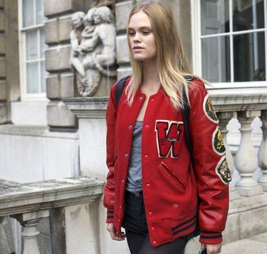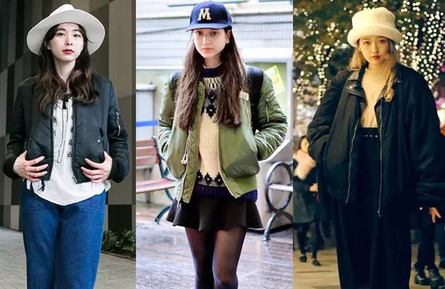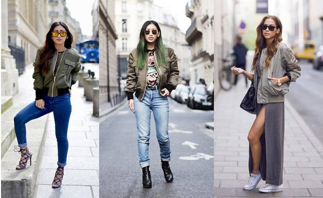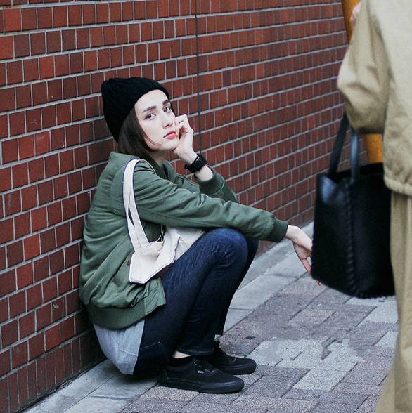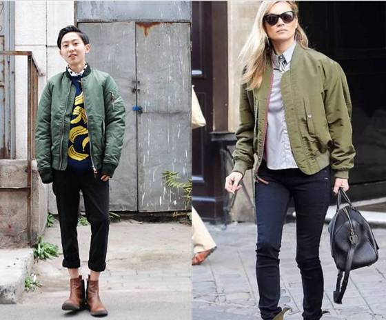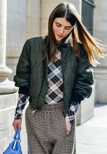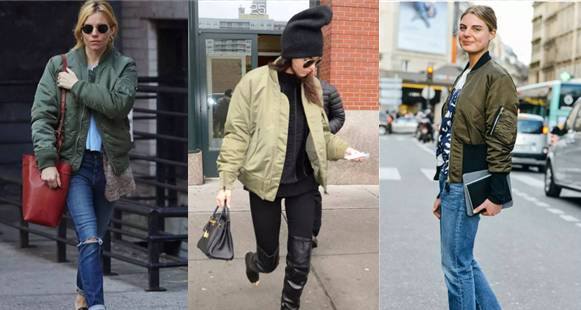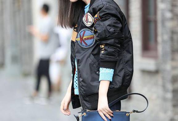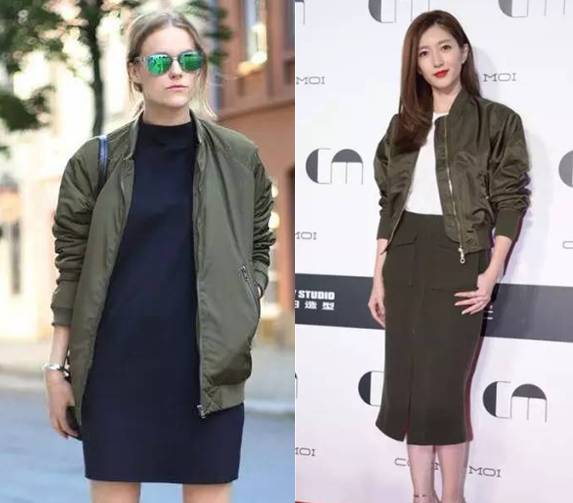 飞行夹克搭配半身裙,裙子选择了和外套相近的颜色。其实,你会发现,这也是一款比较百搭的外套。