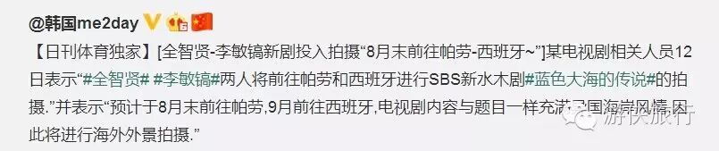 据悉,李敏镐和全智贤预计于本月末前往帕劳,9月初一起飞去西班牙进行15天的外景拍摄,根据剧本,男女主还将会在克罗地亚度假村背景下拍摄出令人深刻铭记的初次见面场景。