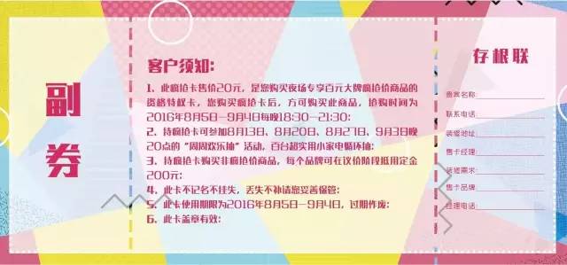 8月13日、8月20日、8月27日、9月3日晚在商场大厅对购买夜场专享疯抢卡的客户进行抽奖回馈,每个抽奖日将抽出20位幸运客户。