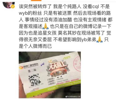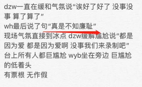 有同样晒出票根去了现场的路人表示,汪涵的确对王一博粉丝自称妈妈发表了看法,但并没有说她们“不知廉耻”,而是说的“不害臊”,不是骂人而在教育。