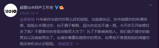 郝蕾十一年前的耳光为什么今天才打出去? 油炸绿番茄 内地女星 2021-02-09 17:49:43 1216 创作不易,用心坚持,欢迎请BaGua喝几杯爱心咖啡!打赏并支持本文 打赏并删除本文 2月7号,演员郭家铭半夜发了一条神神叨叨的微博,宣布自己已经离婚。年轻点的吃瓜群众,对他的唯一印象可能也就是最近热播的【上阳赋】里那个憨批太子。像我这样的80后老阿姨,还记得史上最油腻版肖童和当年与郝蕾那场轰轰烈烈的反目成仇,这可能是十八线糊咖为数不多的焦点时刻。娱乐圈离个婚再正常不过,以郭家铭三个字轻飘飘的分量,这点破事儿连个水花都溅不起来。可能是没人关注,他灵机一动,跟起了最近微博上流行的认子风潮,只不过,他是替前妻认下了跟别人的孩子。前一秒还是“我爱的女人”,后一秒就急不可耐的把一顶硕大的绿帽主动扣在了自己头上。听起来是挺惨的,可惜关注者还是寥寥。于是郭家铭祭出了大招,好死不死的cue起了当年反目成仇的“绯闻恋人”郝蕾。学谁不好,非学陈翔,高举着锤子给自己的陈年旧瓜开膛破肚。我也不是很懂这三条信息之间的关联是什么,这前言不搭后语的程度只有“爽言爽语”才能与之一较高下。不过目的倒是真达到了,不但秒上热搜,而且真有不少人被感动,跑来送祝福:希望两个单身的人能在一起。一起你妹啊。郝蕾工作室以迅雷不及掩耳盗铃小叮当之势,给了郭家铭一记响亮的耳光。同性恋、骗婚、背叛朋友、忘恩负义……短短145个字毫不拖泥带水,信息量巨大,这稳准狠的反应速度,让我想到了当年邓文迪的霸气护(前)夫。据说这条言简意赅的回应是郝蕾在返回北京的航班上仅仅花了5分钟就完成的,建议那些动不动就长篇大论写小作文的明星都来学习一下,话不在多,捡重点的说。俗话说台上一分钟台下十年功,撕逼亦如此,这口恶气,郝蕾已经憋了十一年。郭家铭5岁开始学钢琴,16岁去柴可夫斯基音乐学院学过一阵,后来回国改学表演。2006年,郭家铭参加了《加油!好男儿》的选秀,得了个北京赛区十强,后来收到了电影《我自己的德意志》的邀约,直接退了赛,踏入了影视圈。郝蕾有个男闺蜜是郭家铭当时的男友,二人因此相识,男闺蜜和郭家铭分手后,郭家铭经常向郝蕾卖惨。一来二去,郝蕾还真信了,心生怜悯,跟郭家铭成了闺蜜,主动把他推荐给自己所有的朋友,让他们提携这位弟弟。当时的郝蕾,自己也正处在人生的最低谷,难得有这么个贴心的弟弟来互相抱团取暖。俩人天天彻夜长谈,形影不离,完全没避忌过。外人不知道郭家铭的性取向,传出俩人的绯闻一点也不稀奇,现在想想,这段“恋情”也很有可能是郭家铭主动对外爆料炒作的。2009年,江苏卫视重拍海岩的三部经典剧作,其中【永不瞑目】女一号欧庆春的扮演者定下了郝蕾。当时男一号的竞争者据说有韩庚、吴尊,但是在郝蕾的力荐下,还是娱乐圈小透明的郭家铭顺利拿到了男一号的角色。2010年,已经进组拍摄了一个多月的郝蕾忽然被剧组临时换角,随后媒体收到爆料,说郝蕾在拍摄期间和郭家铭在剧组疯玩,打情骂俏,亲密行为严重影响拍摄,化妆师都没法下手。郝蕾在博客中说,换角的原因是某位台长看了片花说演的不好。这理由,对于一个视演技如生命的演员来说,实在太伤自尊了,尤其是后来的替代者还是赵子琪。 别说郝蕾接受不了,观众也没法接受。 双方协商未果,对簿公堂,郝蕾追讨剩余片酬,共索赔210万,但同时江苏卫视也反诉了郝蕾违约,态度十分强硬。法庭上,作为关键证人的郭家铭选择了背叛,他声称郝蕾经常在拍戏的时候和自己玩到深夜,直指郝蕾不敬业,甚至出具了郝蕾在拍戏期间不敬业的书面证据。电视台为了商业利益翻脸无情对演员来说并不是什么稀罕事,但被最信任的人出卖却给了郝蕾最致命的伤害,这简直就是现代版的农夫与蛇,东郭先生与狼。这场一年多的讨薪罗生门最终以郝蕾胜诉告终,获赔30万。江苏卫视并没有履行判决,郝蕾第二年申请了强制执行才顺利拿到款项。官司虽然赢了,但是郝蕾付出了巨大的代价,直接被江苏卫视封杀,两年没有电视剧可拍,而她曾经的好友郭家铭却如愿以偿的成了“岩男郎”。当然,实力不行,强捧也没用。翻拍的这三部海岩都没有激起多大的水花,但【新永不瞑目】还是成功以4.7分的成绩垫了底。郭家铭功不可没,他扮演的肖童跟陆毅的形象差距实在太大,当年还不流行油腻这个词,只是觉得这个演员从脸到台词,没有一处不蹩脚,普通却自信。卖友求荣得来的男一号却没有水花,不甘心的郭家铭又炒起了郝蕾的恋情绯闻,郝蕾愤怒之余,还是给他保留了体面,没点名道姓,没提能让对方一击致命的性取向。为什么郝蕾没有选择在最愤怒、最无助的时候爆这条猛料,宁愿自己吞下这只苍蝇,忍下这份恶心呢?我猜是她心中的傲气使然。一个守江湖道义的人,是不屑通过踢爆别人性取向这种隐私去赢的。就像我不喜欢谁的文章,可以写文章怼他骂他,但不会拿着放大镜找他可能违法违规的地方然后举报。郭家铭这次为什么敢大着胆子消费郝蕾呢,就是因为他深信对方不屑回击,而沉默,就足够给外人遐想的空间。可惜郝蕾这次没能如他所愿。这份隐忍了十一年的锤,为什么这一次不加犹豫就扔了出去呢?还是为了江湖道义。性取向不是你的错,但是拿出来骗婚、骗子宫、欺骗世人,那就必须要锤死,锤到你这辈子翻不了身,没机