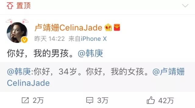 昨天刚过34岁生日的韩庚在微博上对卢靖姗“喊话”,称呼她为“我的女孩”,直接公布俩人的恋情。