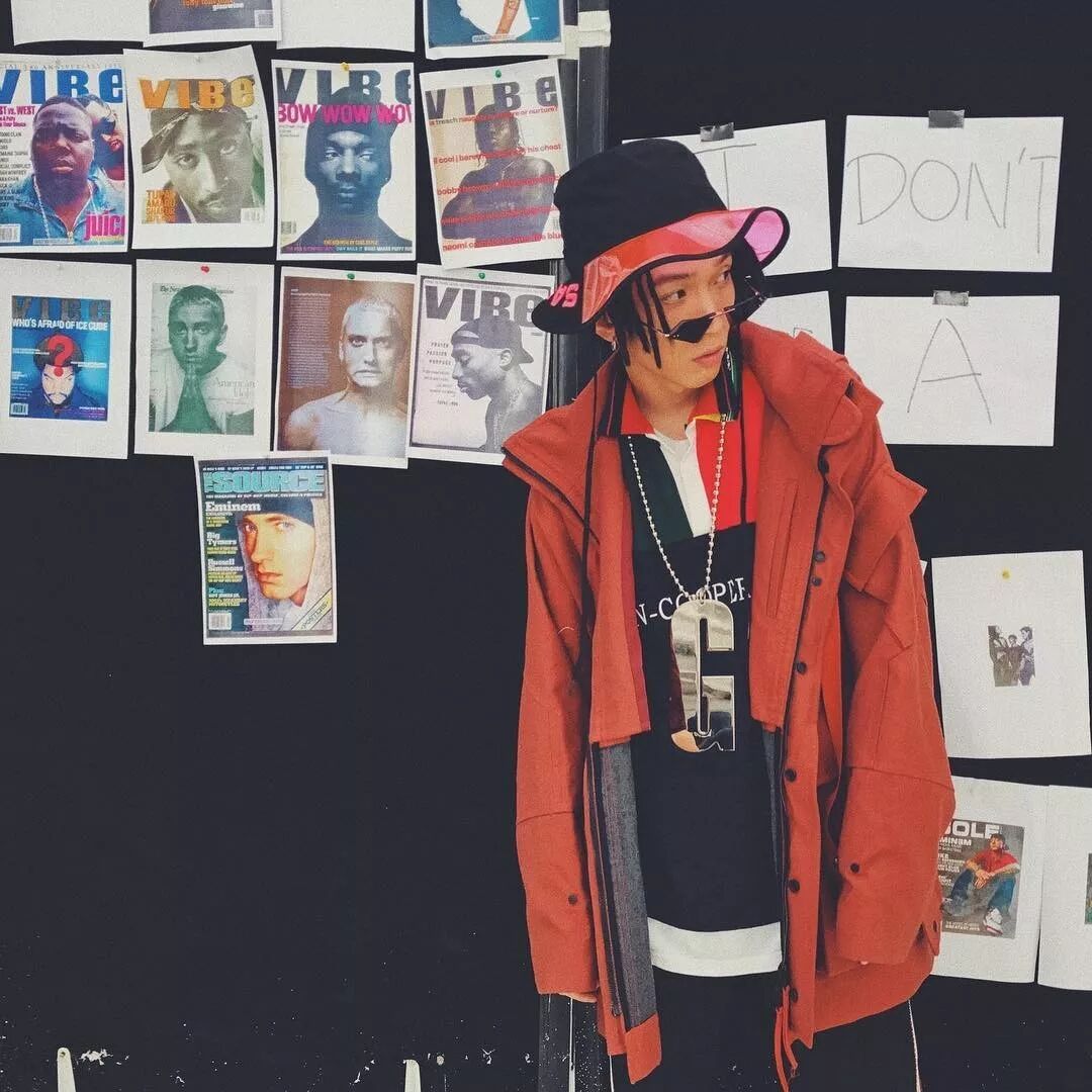 从《中国有嘻哈》脱颖而出的 — 你的男孩 Tizzy T 擅长各种高彩度的亮色系穿搭,亮橘色外套与复古运动风想不到如此搭配,脖子上的项链及造型墨镜、渔夫帽等配件加持,下足了功夫。