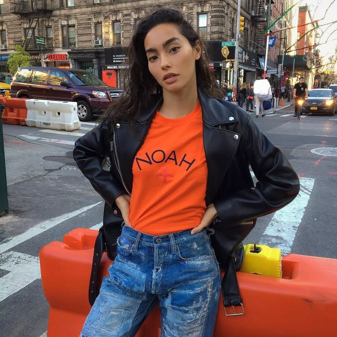 潮流女神 Adrianne Ho 以擅长的美式街头风格演绎秋天造型穿搭,潮牌 NOAH 橘色 LOGO T恤直接切入核心,并搭配率性机车皮衣与破坏牛仔裤,健康性感又充满力量。