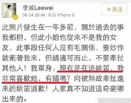 姚笛还陷入了不好的恋情传闻,这次的主角是李威,但李威大方承认自己正在追求姚笛,公开说明自己是单身!并指责爆料方炒作,恳请大家不要把姚笛牵扯进来。