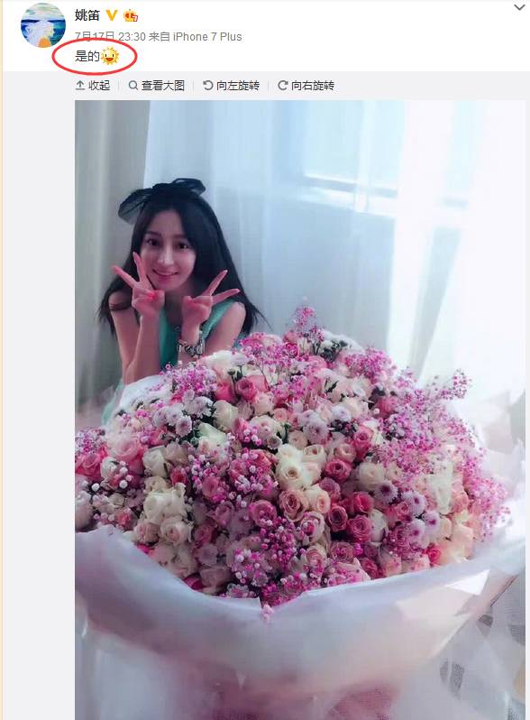 随后,姚笛在微博发文“是的”俩字承认恋情,她还晒出一张收到大捧鲜花的照片,开心比V,看起来十分幸福。