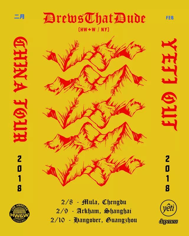 DREWSTHATDUDE 的乐风将 LEFT-FIELD BEATS 与 R&B 元素极致融合,在登上 KITSUNE 派对、RADAR RADIO 之后,受到歌迷与业界的大力追捧。2月10日将来到广州HANGOVER,携手本土Hiphop团体“精气神”的EDI,及Family Flava派对主脑DJ Young,一同缔造劲爆现场!