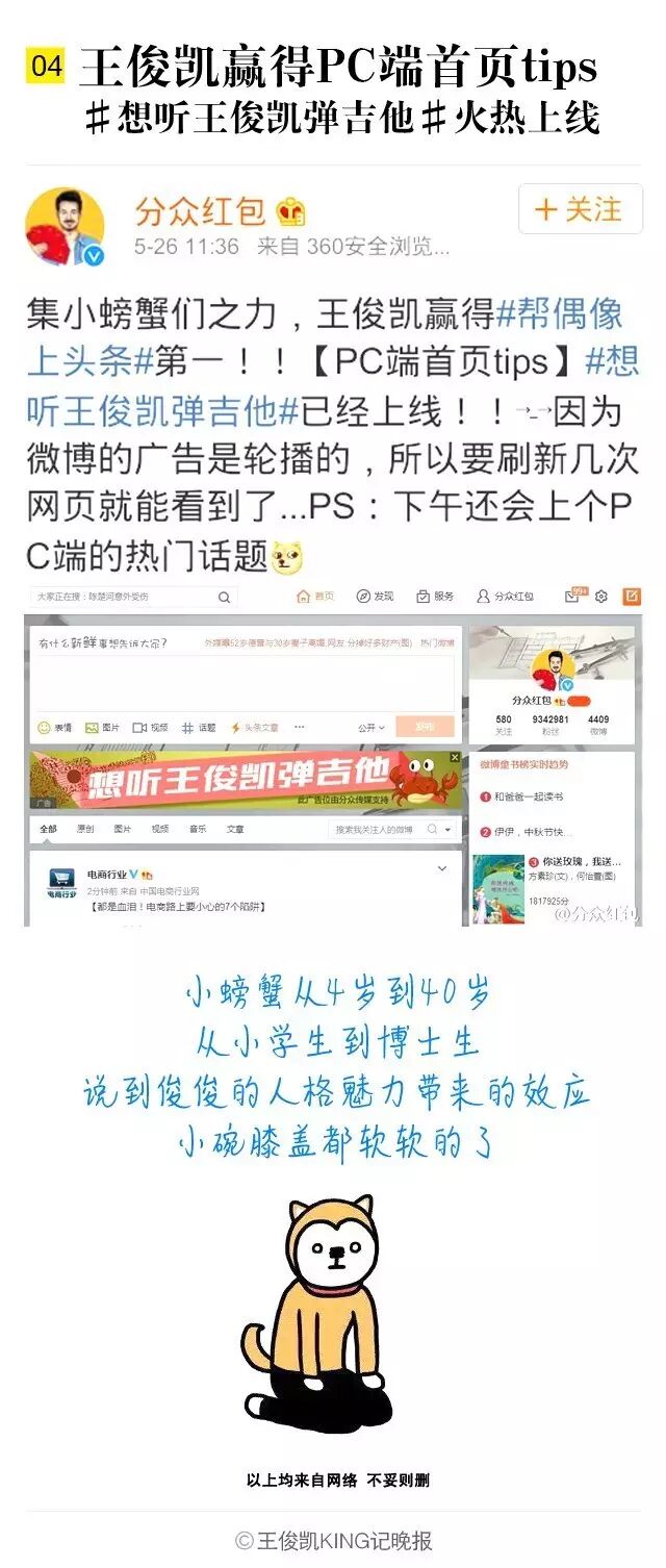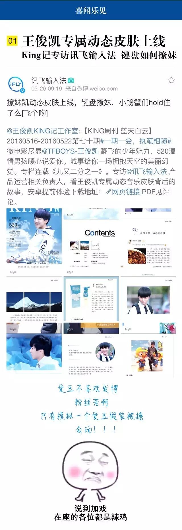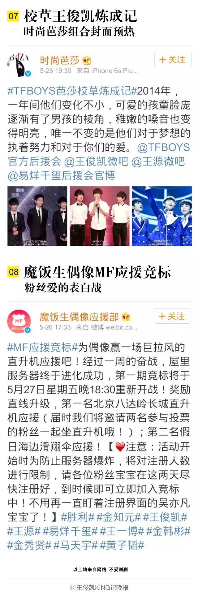 【KING记晚报 今日头条】20160526第五十七期 #大哥快到碗里来# @TFBOYS-王俊凯 赢得#帮偶像上头条#第一,【PC端首页tips】上线。与陈漫近期合作令人期待。央视新闻广征粉丝提问,带你探秘晚会幕后。「守护家」 高萌表情来袭。魔饭生MF应援竞标即将开战。乐耳动听 #邂逅王俊凯的心动瞬间# 今日资讯一起回顾吧!