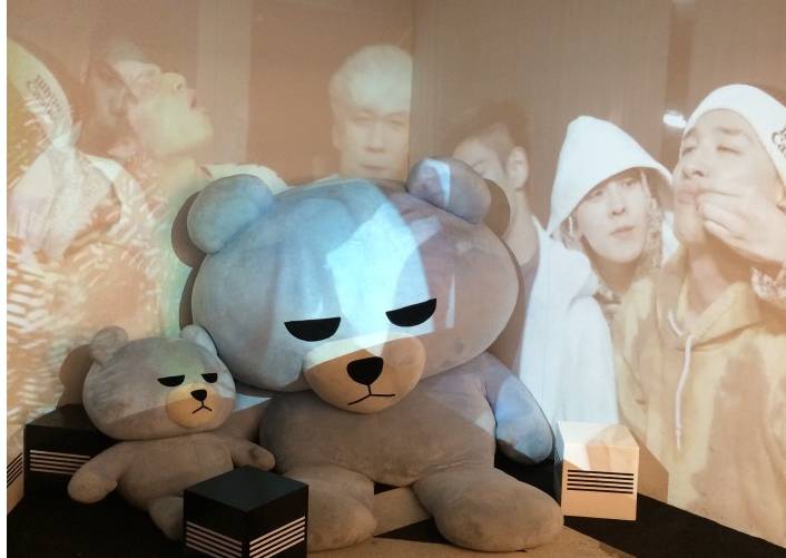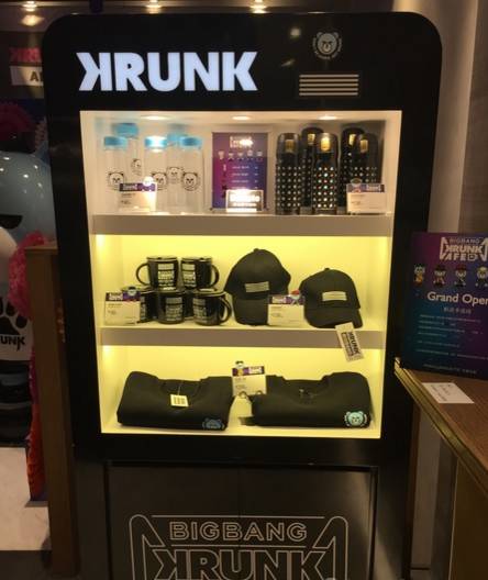 店里播放着Bigbang《MADE》专辑里的歌,店里大屏幕上滚动播放着MV,沙发上椅子上都是Bigbang形象的KRUNK熊。还有各种Bigbang元素的服装,杯子,明信片以及皇冠灯啦~很可惜的是小编当时yg官网买皇冠灯的时候没有上架,只好在粉丝的代购淘宝上入了一支,为了应援!