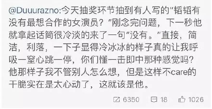 他曾经直接到,在记者一问完“有没有最想合作的女演员”时,云淡风轻又斩钉截铁地说:“没有”,这种不care人情世故的干脆,让人心动!