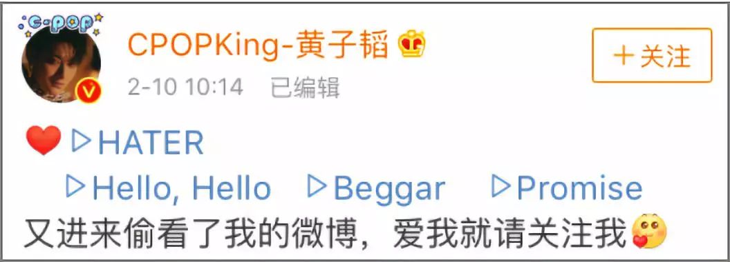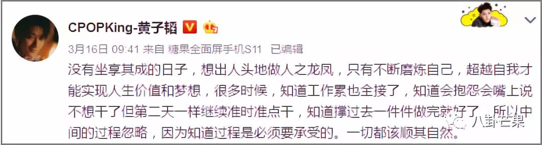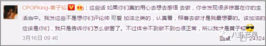 想到现在很多人,好像把“放弃努力”、“丧”、“佛”当作了潮流,黄子韬一直都不这样。他十六七岁的时候敢高喊“世界对我来说没有不可能”,现在敢把微博名叫“CPOPKing-黄子韬”。C-POP是“中国流行音乐”的意思,他把C-POPking当作自己的努力目标并大声说出来,勇气可嘉。