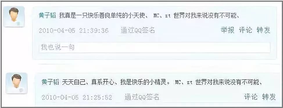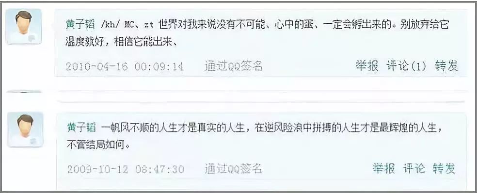 黄子韬的确一直对“努力向上”非常执着,而且精力旺盛!有网友挖出他以前的QQ签名,那时他十六七岁,是一个还没出道默默无闻的小男孩。他一直在QQ签名给自己打气——“世界对我来说没有不可能”、“我是善良的小天使”、“我是快乐的小精灵”!