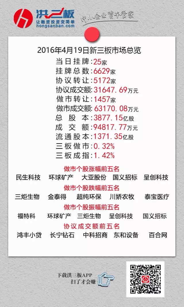 唐人影视今日上市,胡歌、刘诗诗、高圆圆笑而不语 洪三板 内地女星 2016-04-19 19:03:58 297 创作不易,用心坚持,欢迎请BaGua喝几杯爱心咖啡!打赏并支持本文 打赏并删除本文 洪三板日报不要眨眼精选过去24小时最具价值的三板资讯 市场总览 4月19日,新三板做市指数收报1251.88点,涨幅0.32%,三板成指1301.61点,涨幅1.42%;共有1078只个股成交,成交总金额达9.48亿,其中做市成交金额达6.32亿元,协议成交金额达3.16亿元。做市个股平均市盈率28.04倍,换手率0.23%。新三板企业分红实施完成情况统计如下: 三板头条 01新三板再添“星光”今日获得胡歌、刘诗诗、高圆圆等明星潜伏的唐人影视正式登陆新三板,为新三板再添“星光”。(明星参股新三板企业部分名单)明星投资不是什么新鲜事,以往明星投资多以自己操刀做实业为主,开餐饮、服装店的占大多数;而现在则转战资本市场,多以股权投资为主。当然,伴随中国消费升级,娱乐影视必然受到资本青睐,这是趋势。 网友吐槽莫拉德:小燕子可是娱乐圈最会投资的,是投资圈最会演戏的。胡子良:人人都是IP,不用浪费了。02分层配套措施能否落地新三板分层机制将于五月份正式落地。大家期待分层之后,新三板在融资、流动性、制度等方面的情况将会得到改善。同时,关于推出新三板集合竞价制度、降低500万准入门槛、推出大宗交易制度的讨论甚嚣尘上。 网友吐槽辛如水:心急吃不了热豆腐。西西里:500万,呵呵,我昨天还在睡天桥。03“准创新层”交易成交放量昨日,全国股转系统组织了新三板市场分层信息揭示首轮仿真测试,当天“准创新层”交易成交放量。截至4月15日,已经有3740家公司披露了年报。统计显示,有490多家符合创新层标准,其中60余家企业满足多套创新层标准。多位市场人士估计,最终进入创新层的企业数量将在1000家左右。 网友吐槽司马颜:问君能有几多愁,几家欢喜几家愁。莫文平:以前怕考试,现在求考试。洪三板中小企业资本管家三款明星产品轻松化解投融难困境欢迎有钱缺钱的企业或股东链接我们如有疑问,欢迎致电: 400-676-3818识别下方二维码,优质BP送到手识别下方二维码, 再也不缺钱欢迎出门左转,点击“明星产品”栏,更多惊喜等你开启我命令你把洪三板客户端装入口袋 创作不易,用心坚持,欢迎请BaGua喝几杯爱心咖啡!打赏并支持本文 打赏并删除本文 感谢您的支持鼓励,我会继续努力的!文章地址:用户邮箱:打赏金额:USDT 请输入数字点击”去打赏“,即可进行打赏支持本文章哦 刘诗诗 About the Author 洪三板 功能介绍:洪三板专为解决新三板行业用户痛点而生,新三板优质企业的价值发现、价值挖掘和价值推广平台,企业挂牌新三板过程中的贴身导师!关注洪三板,一起成长,一起飞! Related Posts 吴奇隆46岁还敢如此任性花钱 全凭一个会投资新三板的老婆! 2017-09-12 17:31:58 唐人影视今日上市,胡歌、刘诗诗、高圆圆笑而不语 2016-04-19 19:03:58 发表评论
