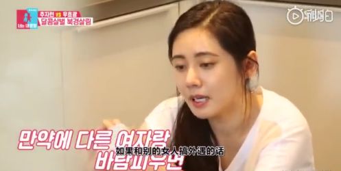 ▲比如秋瓷炫威胁“如果和别的女人搞外遇……”,于晓光就马上用蹩脚的韩语绘声绘色地模仿秋瓷炫的口气——“我死你也死”,弄得老婆哭笑不得,只好作罢。