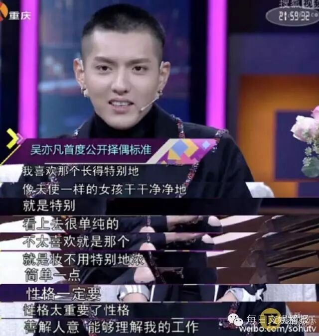 近日,吴亦凡做客某访谈节目时,曝光了自己的择偶标准:单纯+不浓妆+性格好+善解人意+像天使一样干干净净。想做凡凡老婆的各位小主们,赶紧照着做吧!