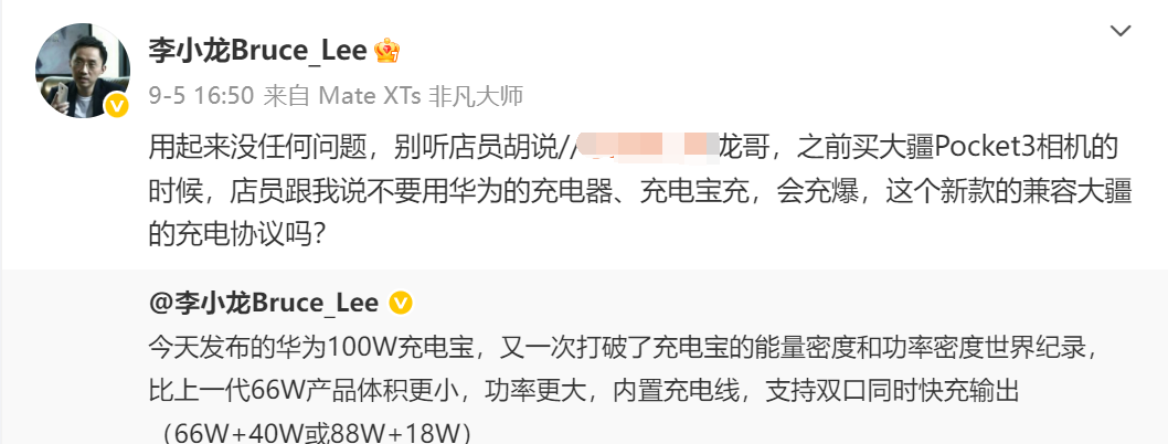 华为BG CTO(首席技术官)李小龙宣传自带线充电宝时,有网友询问:之前买大疆某款相机时,大疆电源说不要用华为充电器、充电宝,会爆炸,询问最新充电宝是否金融大疆充电协议。李小龙怒斥这种说法没有根据,华为充电宝给大疆充电没有任何问题,让这位网友不要听大疆店员胡说。