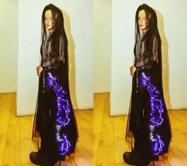 就这个蒙娜丽莎造型吓坏了网友,身上穿的衣服还自带闪光灯效果,半露胸膛,怎么看怎么觉得怪异。