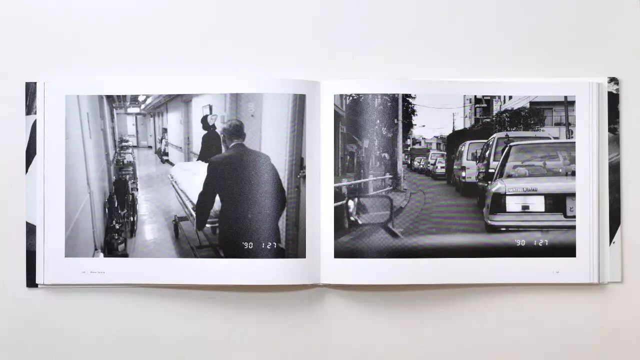 从其中一张抱着花的背影开始,这一天荒木知道阳子不行了,来医院送她,买了花,上台阶的时候看到自己抱着花的影子挺悲伤的,拍了下来。荒木拍了病床边两人握在一起的手;拍了病床前盛开的花;拍了医护人员把阳子推走。荒木跑到街上拍车流、建筑、摩天轮,还有划过天空的一道白烟,色调沉重阴郁,此时荒木是不是已经随着抽泣在浑身颤抖了?不停地按快门可能也是消解。接下来是荒木在席间吹牛搞笑的照片,当着那么多亲朋好友,哭晕就不是他了。处理后事那天荒木出门时拍了缩在冰箱顶上的爱猫奇洛,奇洛再也看不到它的女主人了;拍了阳子的遗容和扶在灵柩边众人的手,阳子的脸旁摆着奇洛的画册;拍空空的床和孤零零的猫,猫蹲在桌子上望着窗外。外面下雪了,荒木打开窗,奇洛冲到阳台上,在雪地里高兴得撒欢,蹬起后脚的这个瞬间也是荒木名作,奇洛一边跳一边跟主人说“快别不开心了,出来玩儿啊”。写下这些除了部分在书上看到的,其他都是我作为观众的臆想,因为荒木这人到底是什么样很难令人琢磨透。我在照片前偷偷飙泪,待看别人的反应,仿佛大家都没什么事。