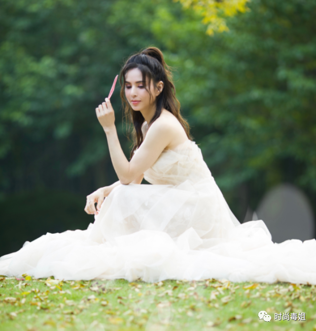 随意坐在草坪上的李若彤,将洁白的婚纱展开,面无表情仍美得宛如不食人间烟火的仙女,纤纤玉手搭在两侧,树木与绿叶做陪衬,整个画面让人感觉很舒适,化着淡雅的妆容清纯动人,其实天生丽质的李若彤不需要浓妆艳抹,清清淡淡是她身上独有的味道。