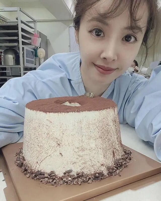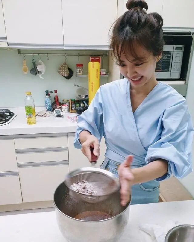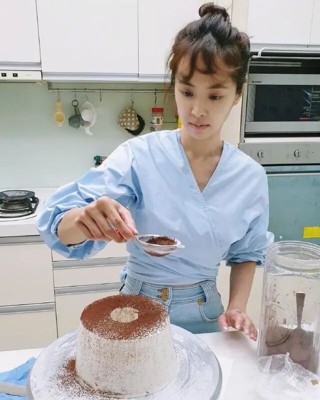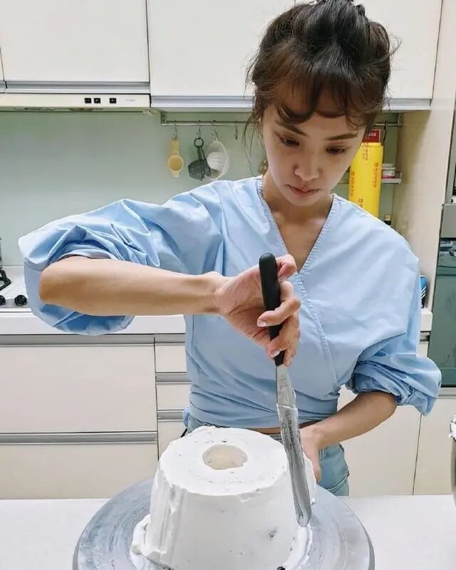 新浪娱乐讯 11月10日,蔡依林近日于社交平台晒出与蛋糕合影,蛋糕教室也发了照片。照片中的蔡依林扎起丸子头,身穿一袭蓝色裙子,专心致志地做戚风蛋糕。