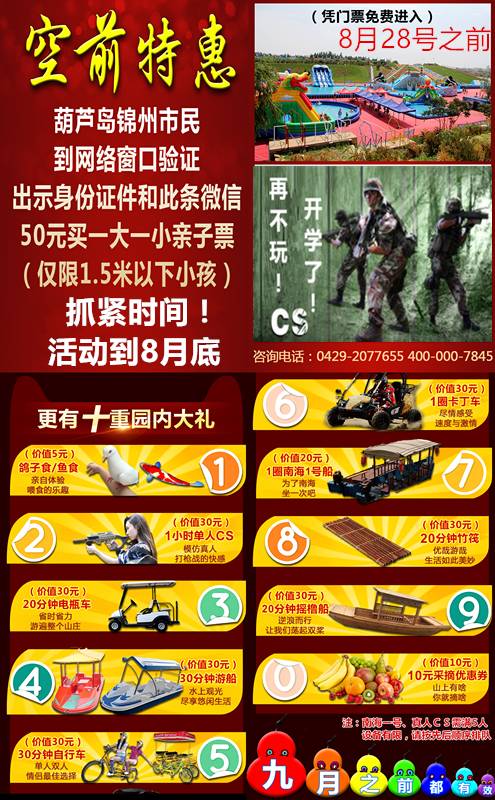 葫芦山庄特惠套票--免费畅玩十个游乐项目,葫芦岛和锦州市民即可享受50元/人(原价325元)咨询电话:0429-2077655